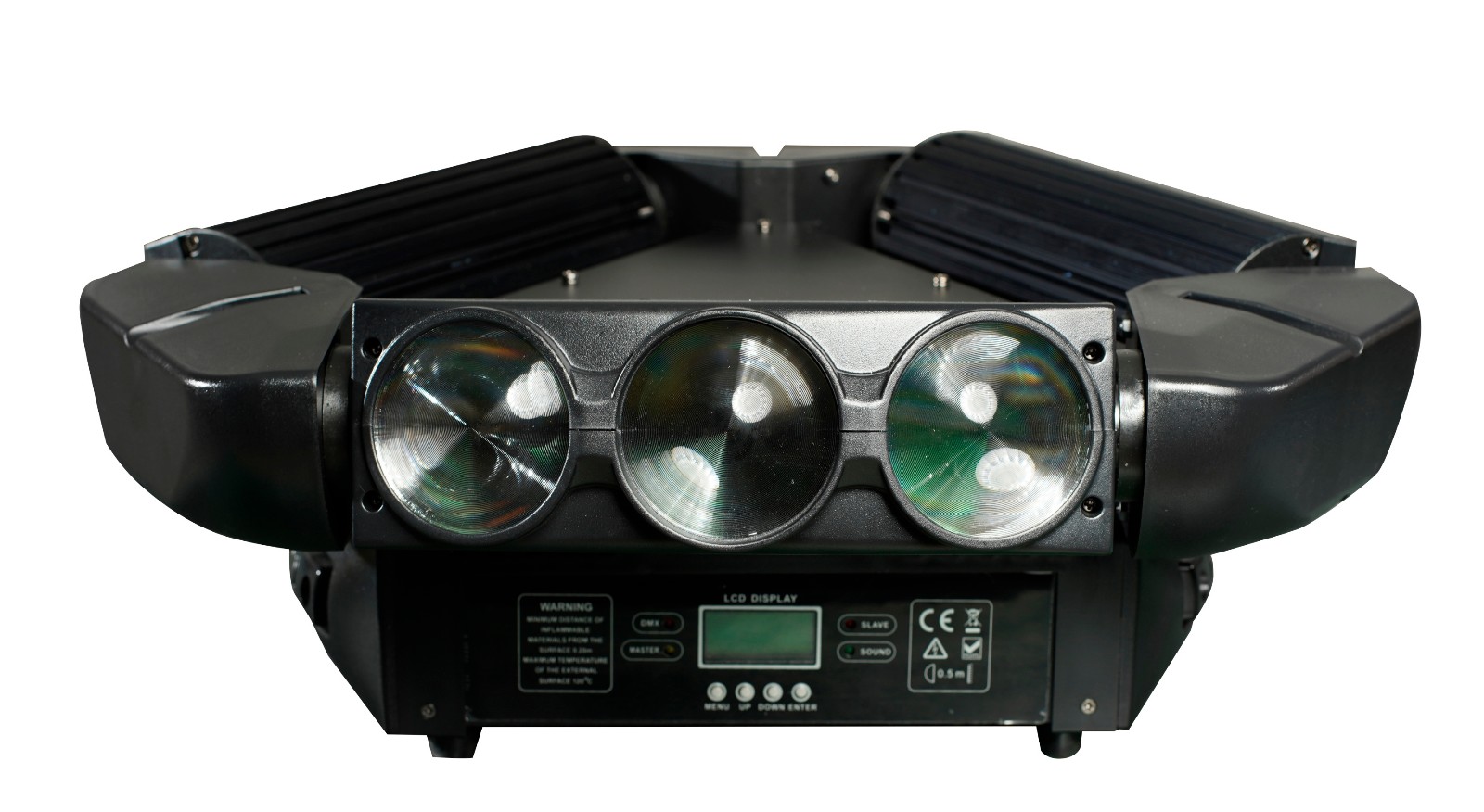 内置主从,声控和显示模式。 LED数字显示,易于控制。 通道:1CH,12CH,8CH,14CH,18CH和50CH。 操作模式:声音测试,显示模式,DMX和主/从模式。 电压:AC90-240V,50 / 60Hz 功耗:P = 120W 电源:180W 保险丝:F3A L250V LED:9 * 10W RGBW 4in1 CREE LED 调光:0-100%