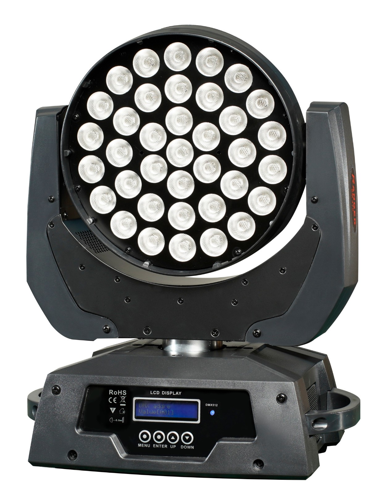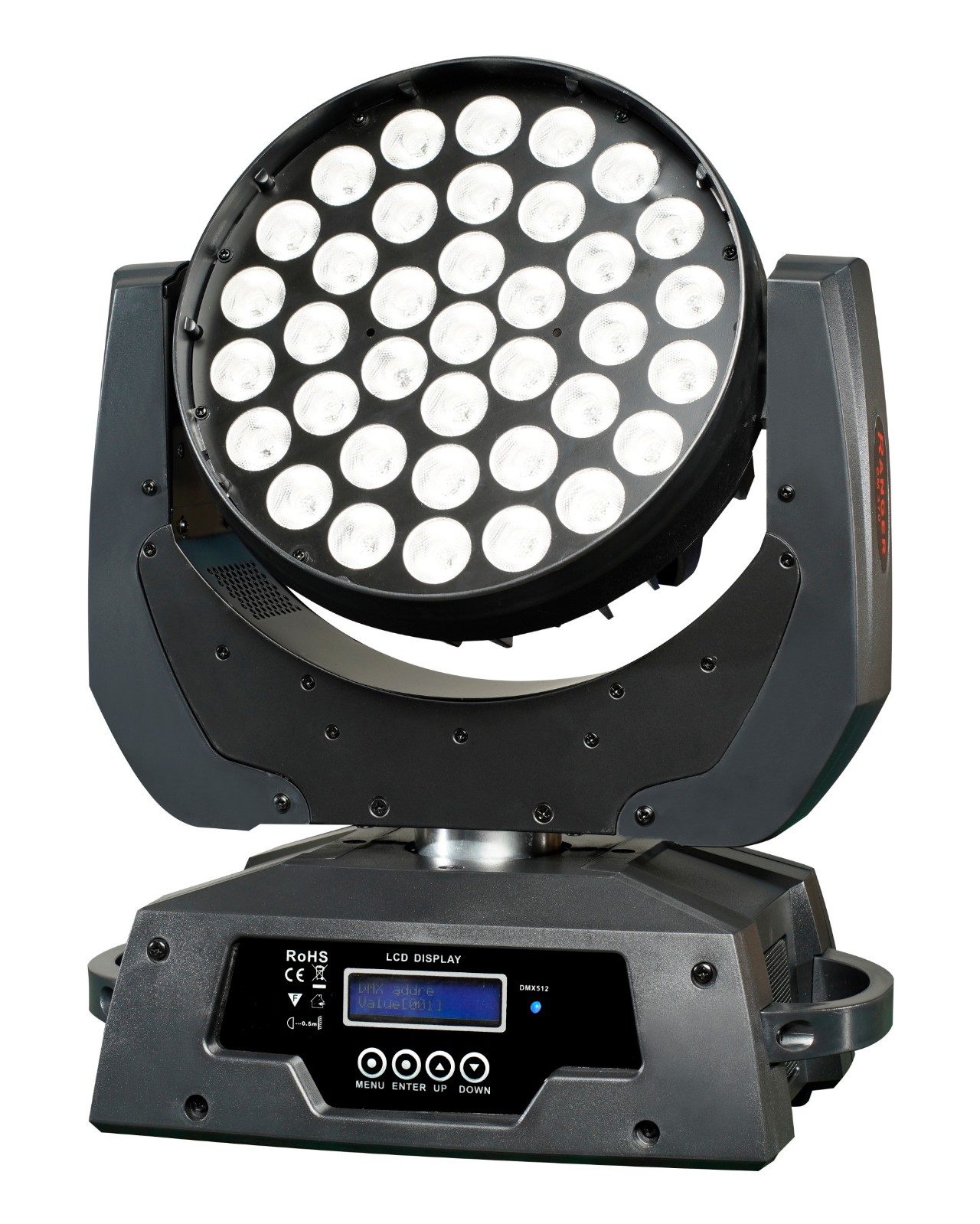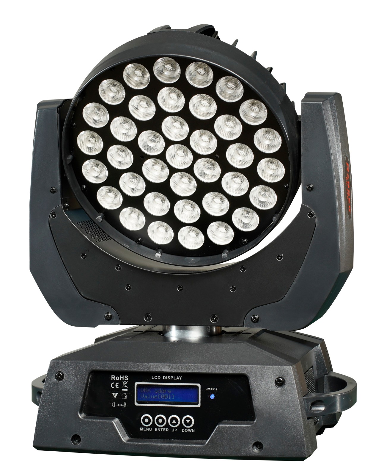输入电压:AC90-/240V 50/60HZ 功率:350W 光源:37 颗 9W 3 in 1 LED 颜色:RGB 无极混色系统 发光角度: 25 度 通道:13/21 通道 控制:自走,声控,DMX,主机 功能:红蓝绿混七彩,颜色选择,颜色变化,调光,频闪,XY 轴摇头 及速度控制 水平扫描:540 度+微调 垂直扫描:280 度+微调 净重:9KG 毛重:11KG 尺寸:425*295*400MM(1 台/箱)