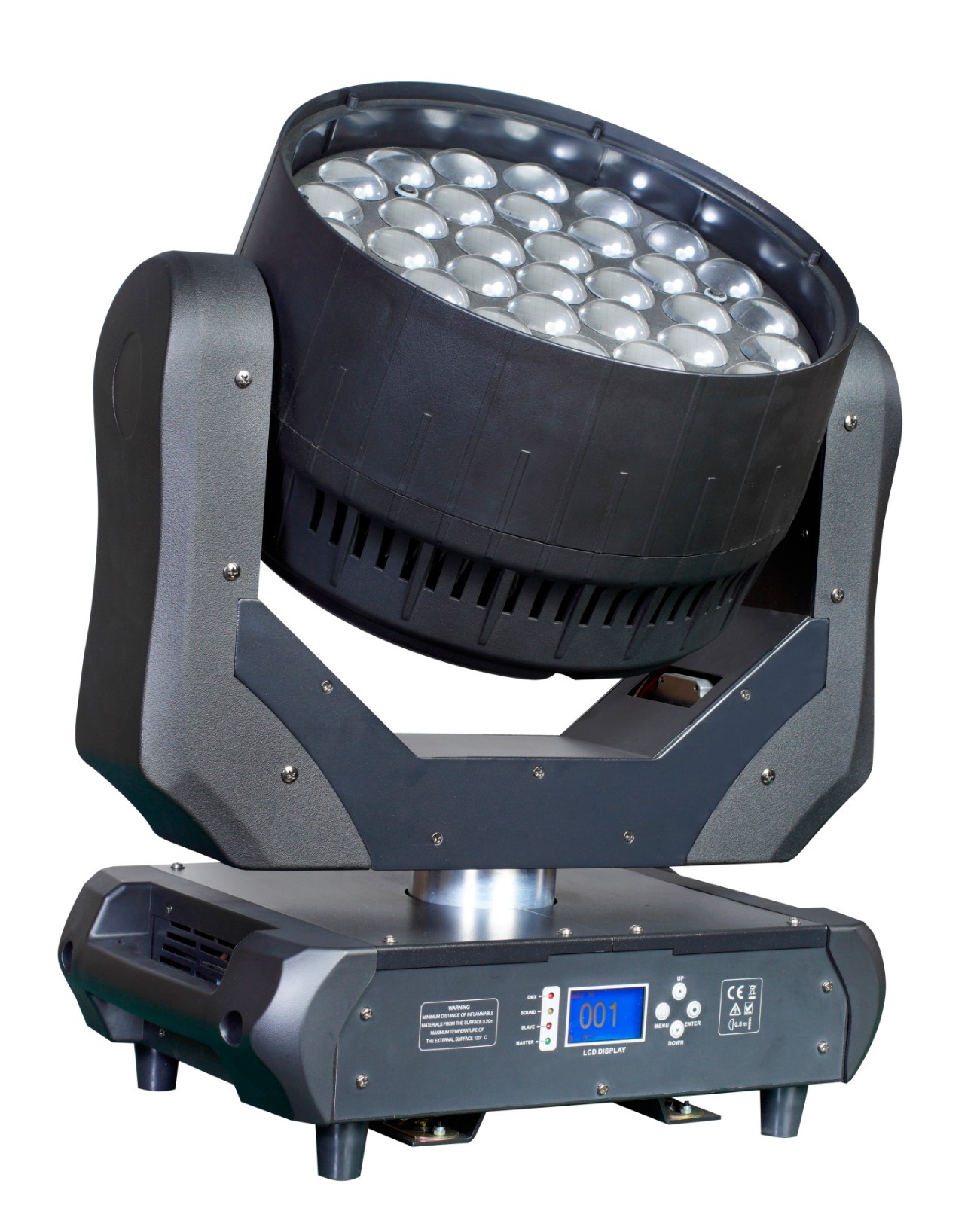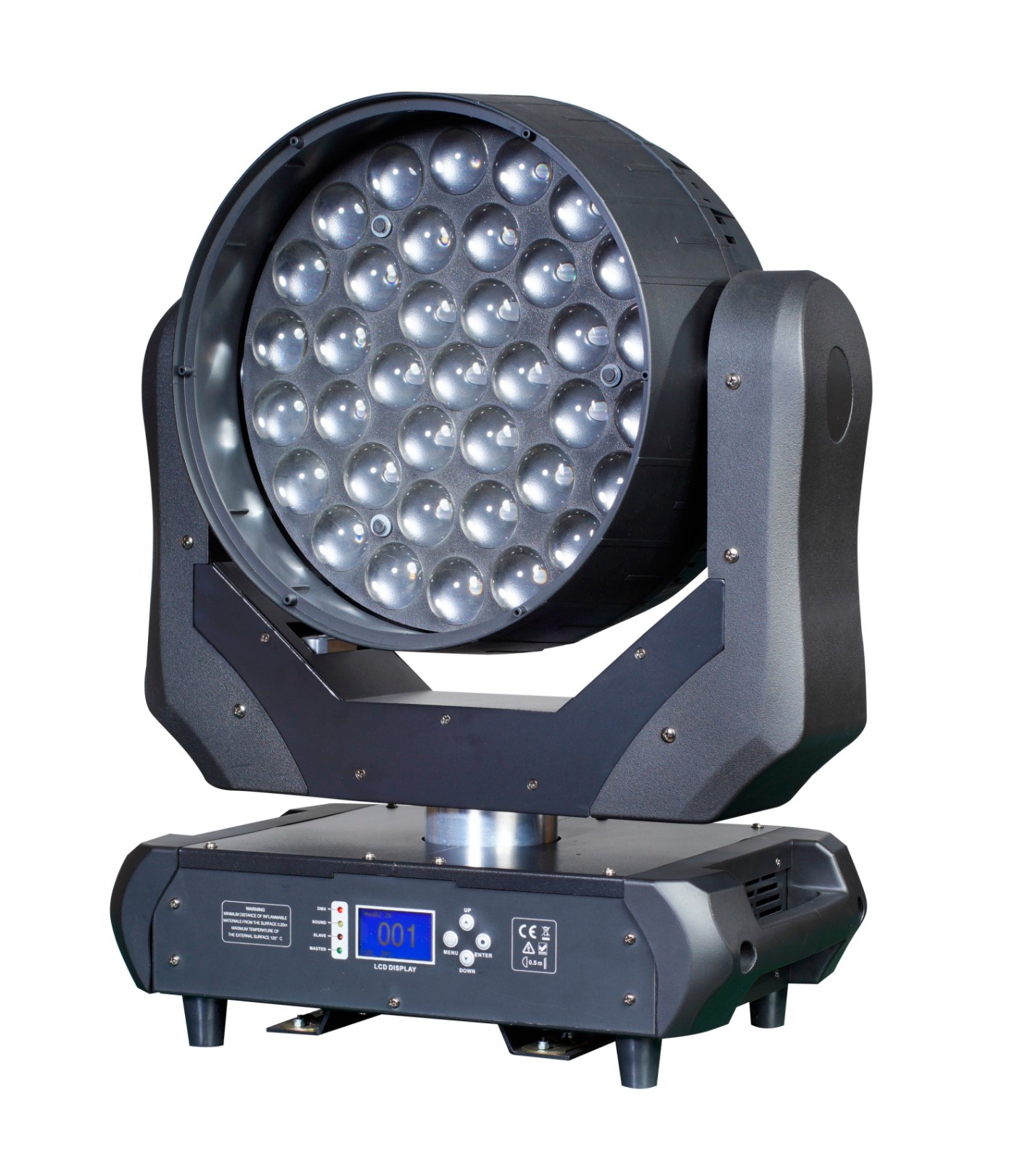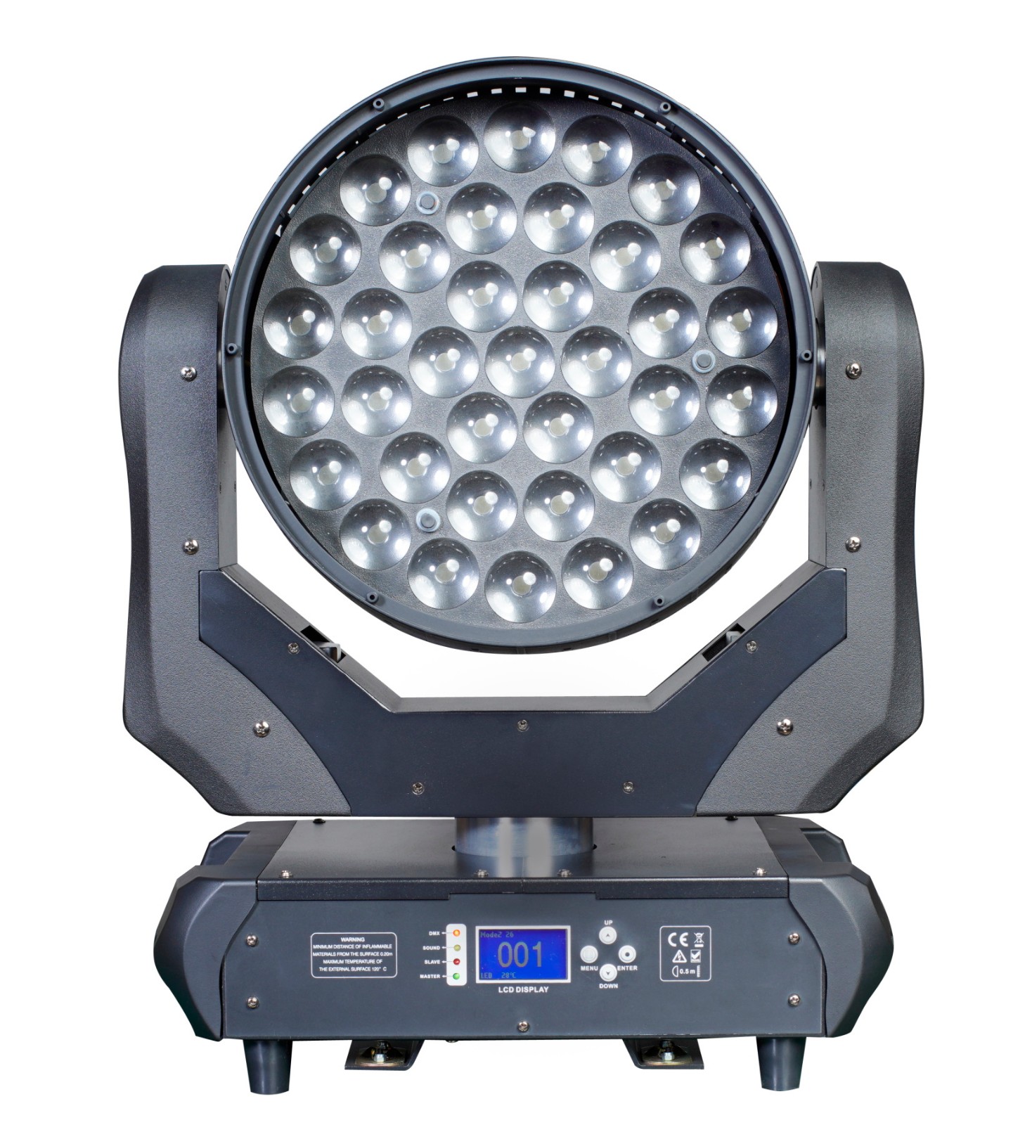 功能全面可快速移动的 LED 效果灯; DMX 通道:14、26 两种通道模式; 在主副机模式下有内置的表演功能; 适用于舞台、剧院、电视演播厅与舞厅; 电压: AC 100~240V,50/60Hz 消耗功率: 704W 最大联机数量: 230V,50Hz: 9 台; 120V,60Hz: 5 台; LED 光源: 37 × 10W RGBW LED 光角度: 10° ~ 60° 重量: 19.5Kgs 尺寸: 430 × 246 × 512mm
